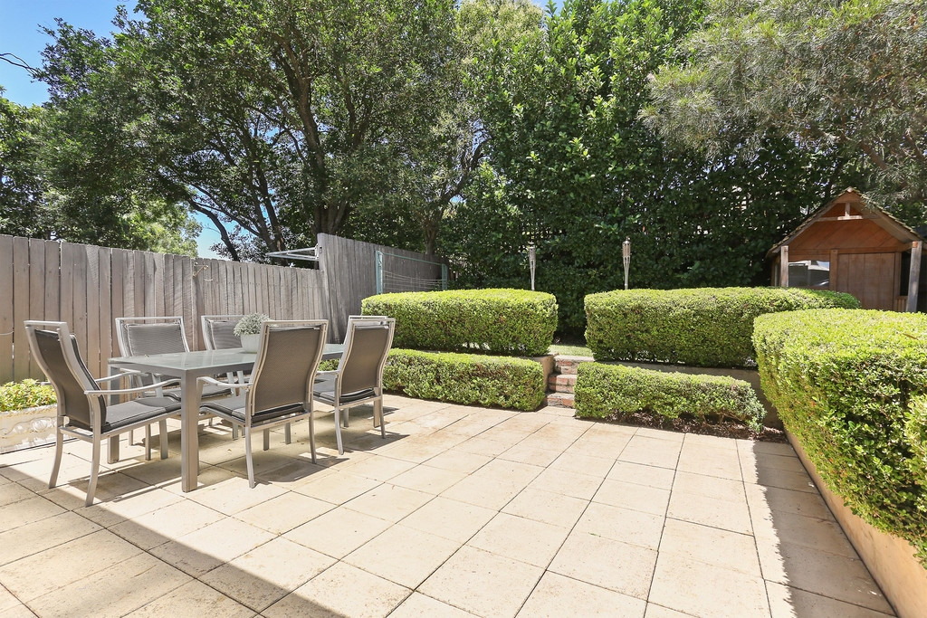 Leafy garden with lawn, paved dining patio and cubby house