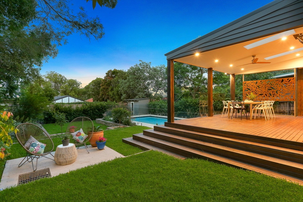 Ultra-private landscaped garden with terrace lawn and swimming pool