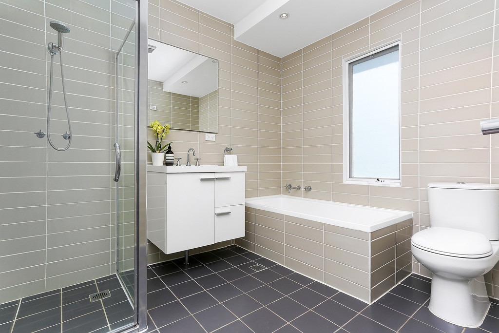 Modern full bathroom, air conditioning and polished floors